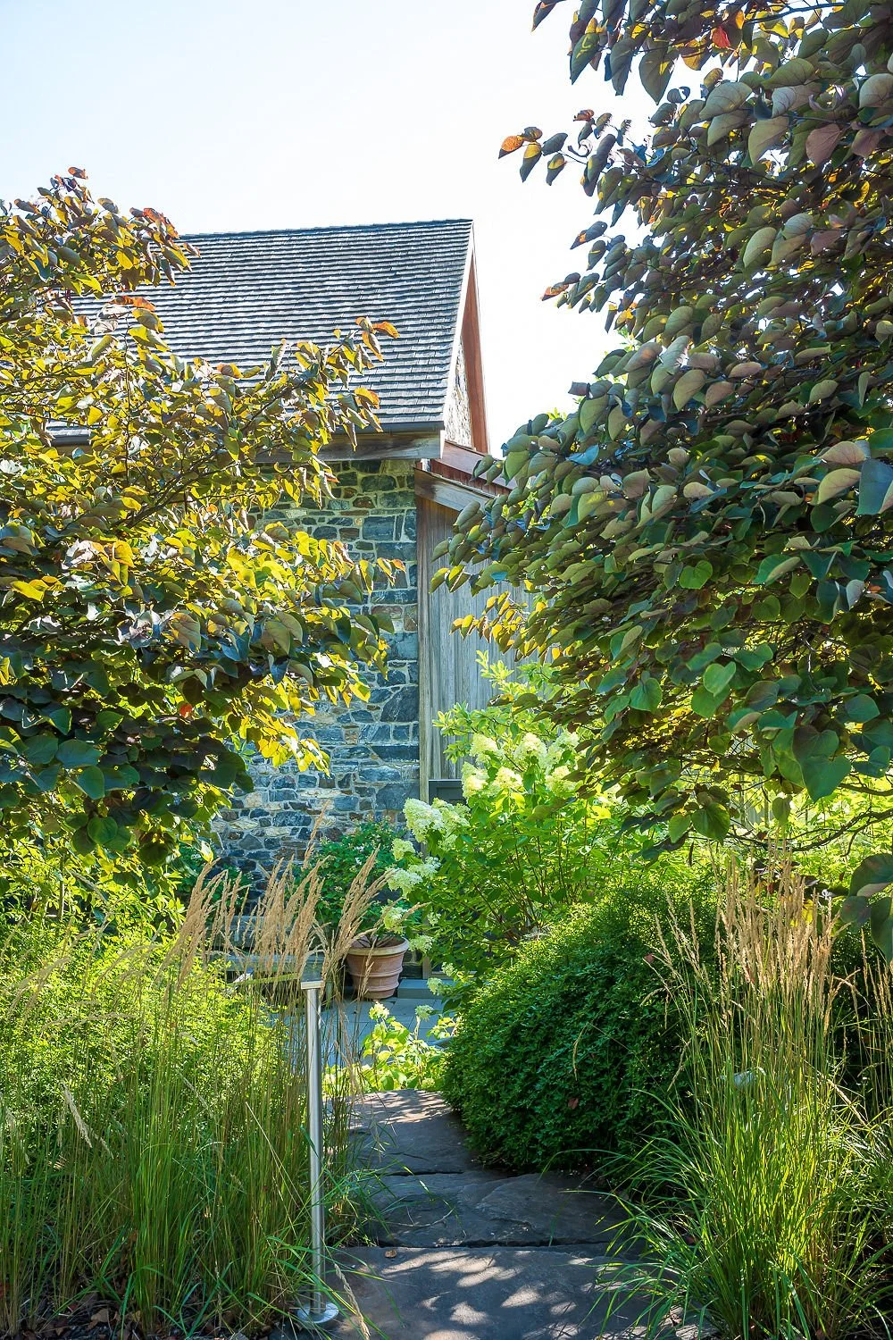 Built around an existing barn and silo, this residence references the local farm vernacular of Chadds Ford. A lawn ramp to the front door stretches over a sunken shade garden and breakfast terrace. On the back side of the home, a walled barnyard is reimagined as a secret garden. A trellis connecting the garages separates the parking court from an additional patio. Warm season meadows wrap around the home, tying it to its context.